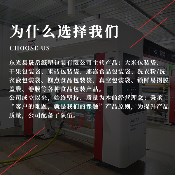 東光縣晟岳紙塑包裝有限公司主營產品:大米包裝袋、干果包裝袋、米磚包裝袋、速凍食品包裝袋、洗衣粉/洗衣液包裝袋、糕點食品包裝袋、真空包裝袋、鎖鮮易揭膜蓋膜、卷膜等各種食品包裝產品。 公司成立以來,始終堅持、質量為本的經營理念;秉承“客戶的難題,就是我們的課題”產品原則,為提升產品質量,公司配備了隊伍。
